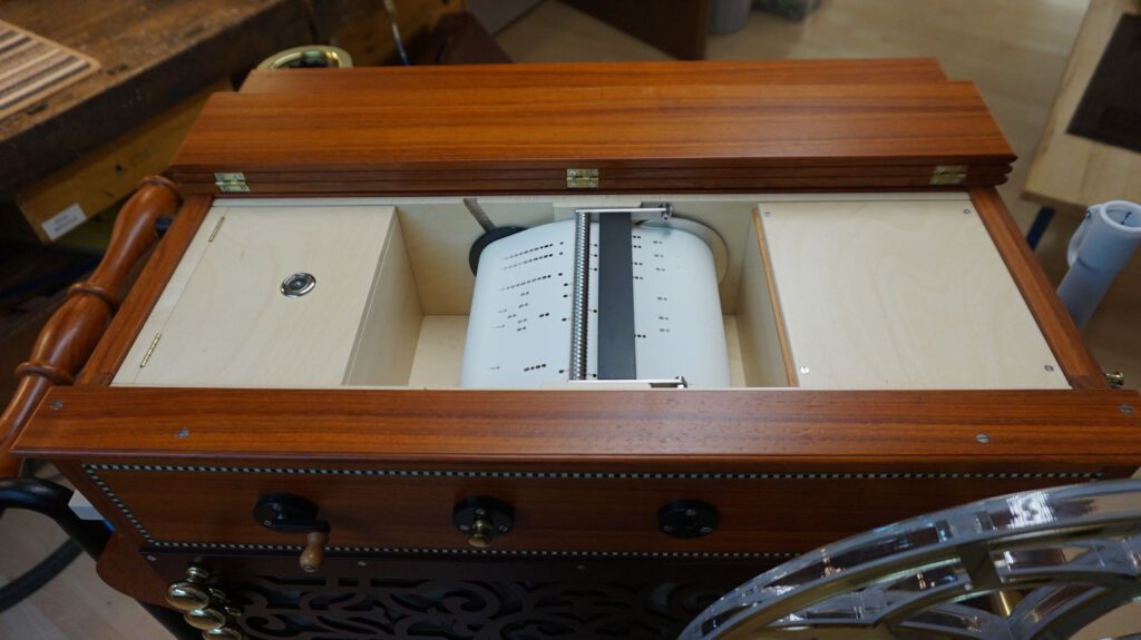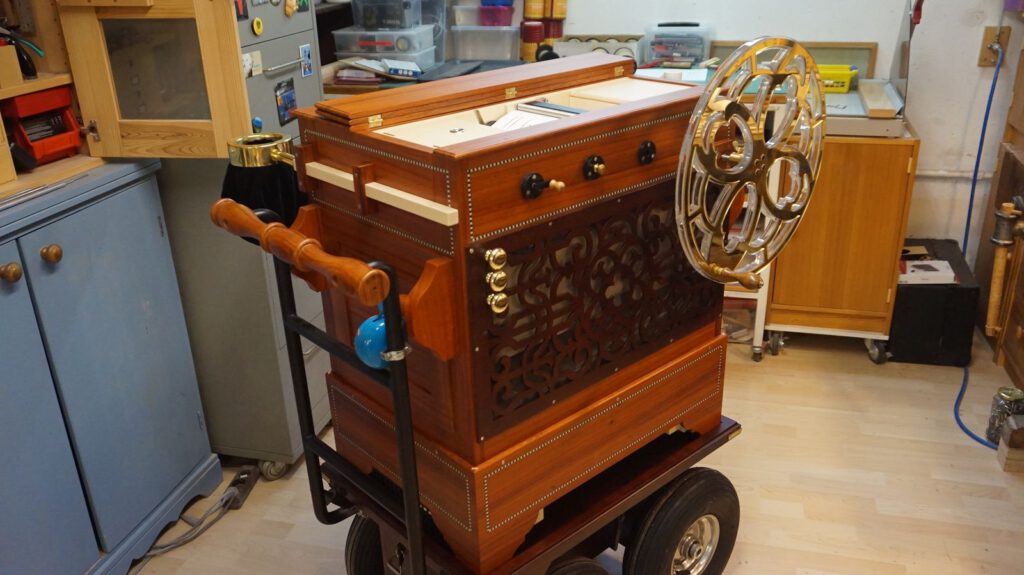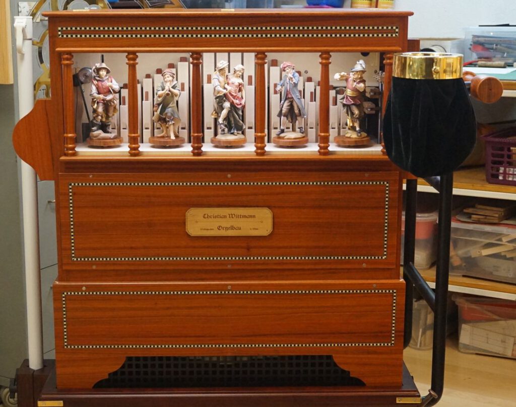 Baujahr 2019 mit zwei Pfeifenregistern, Glockenspiel, Figuren, gebremster Drehorgelwagen, 49 Rollen
